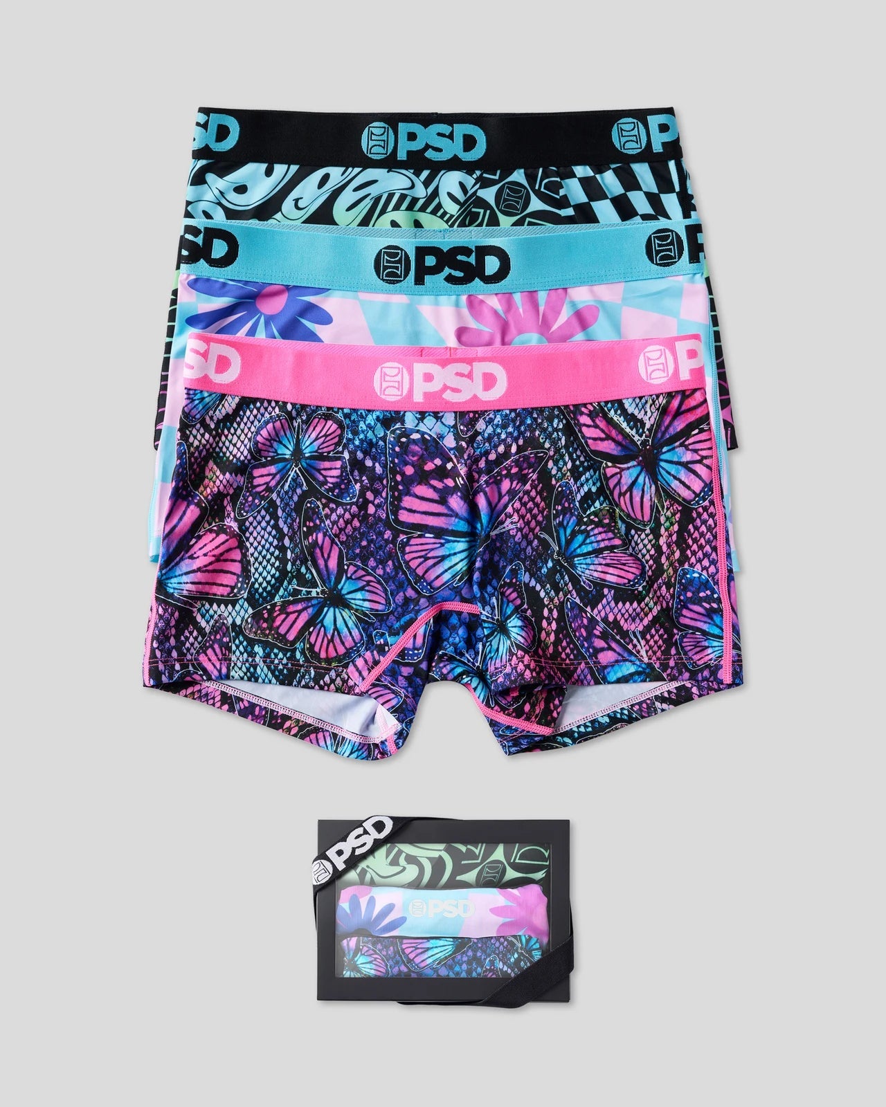 Stock up on our best-selling Boy Short with this colorful and trippy three-pack. Made from our silky poly blend with a comfortable full coverage. keep-you-in fit. the PSD boyshorts are perfect for everyday wear and working out.