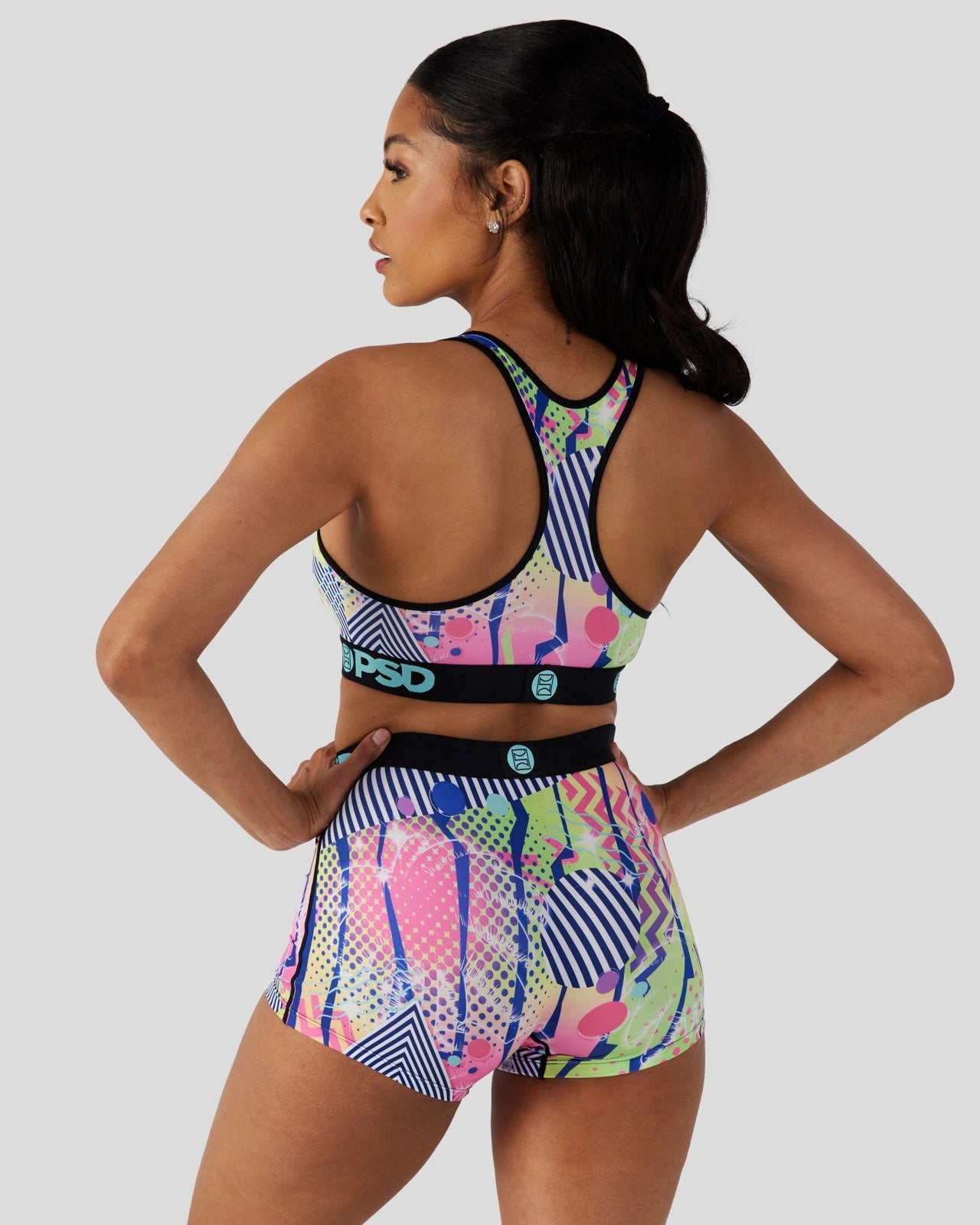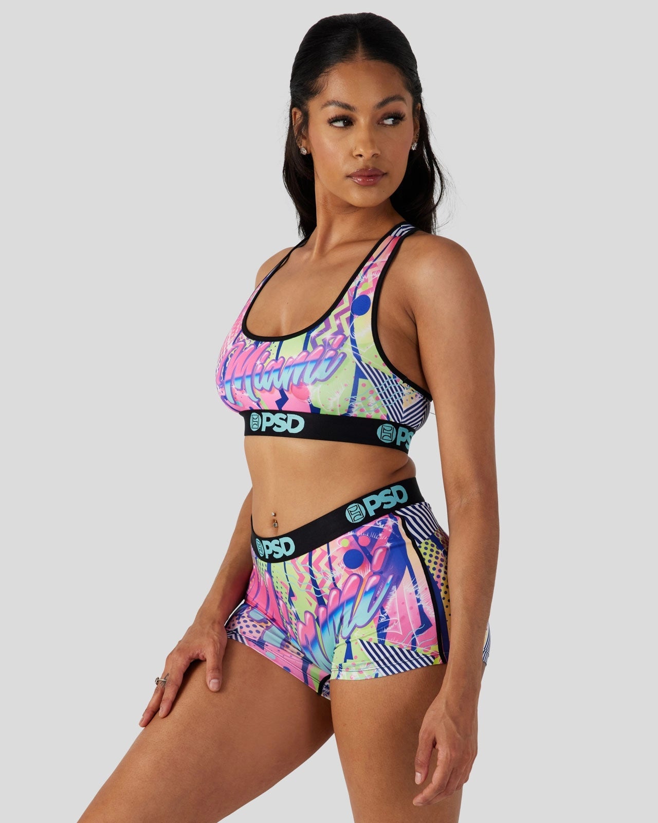 Featuring neon colors and an early ’90s-inspired print. this bra will take you back to a time of big scrunchies. acid wash jeans. and giant hair. Made from a silky poly blend. this the ’90s Miami Sports Bra is breathable yet slightly compressive. bringing you the comfort and support you need for everything you get into.