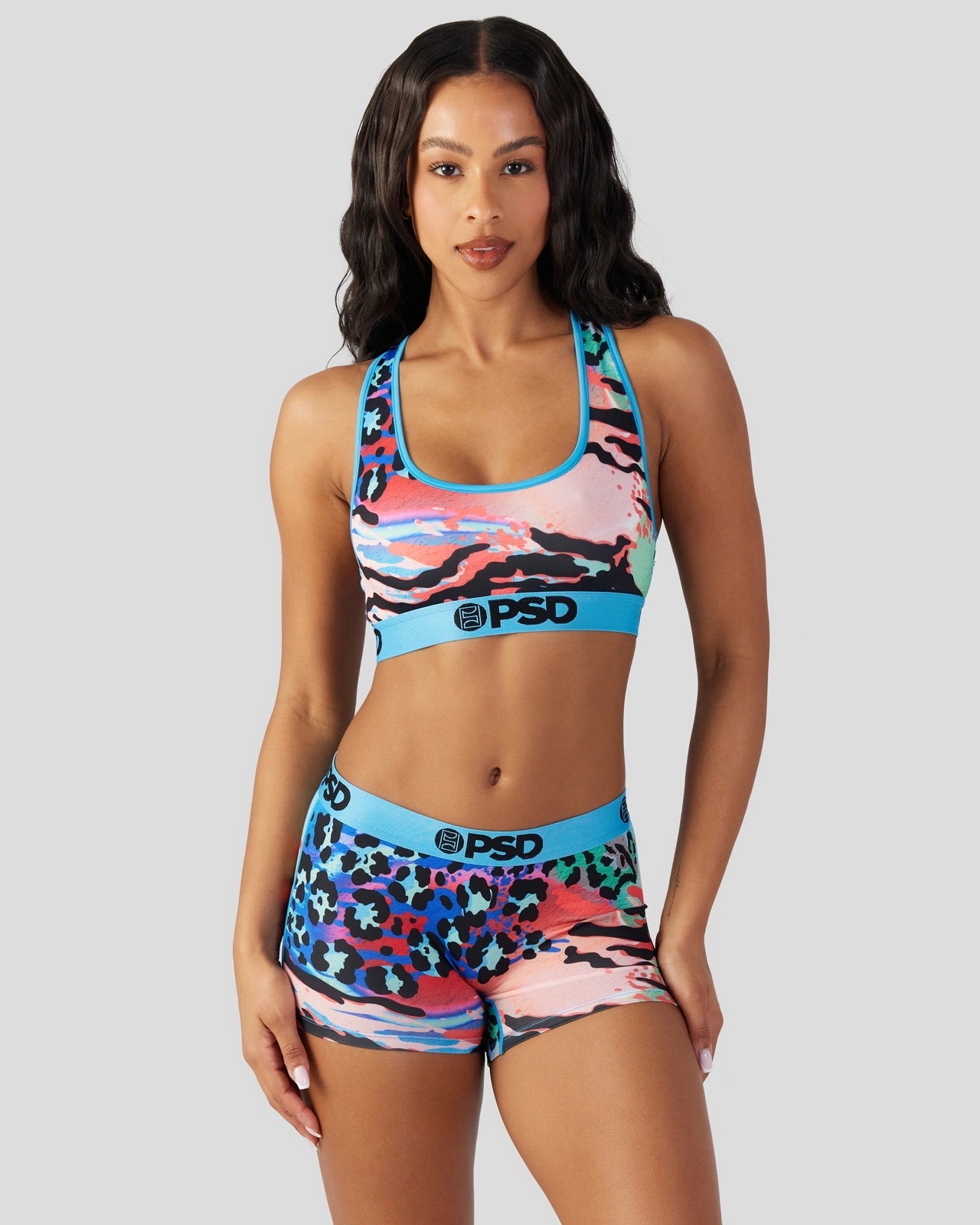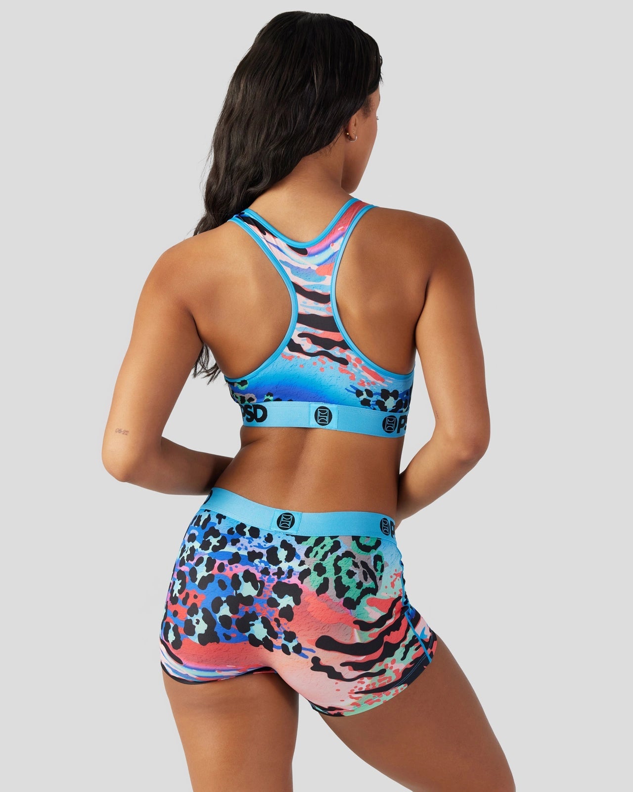 Make a wild statement in our new multi-animal print style. The Feral Sports Bra is made from a silky poly blend with a comfortable full coverage. keep-you-in fit. The PSD boy shorts are perfect for everyday wear and working out.