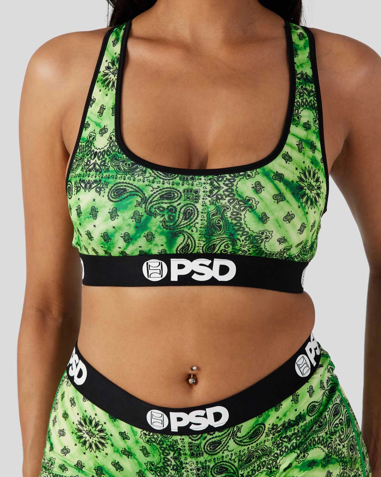 Feeling lucky? You will once you slip into this new bra. Featuring a green tie-dye bandana print. the Lucky Dye Sports Bra is made with our silky poly blend and is breathable yet slightly compressive. bringing you the comfort and support you need for everything you get into.