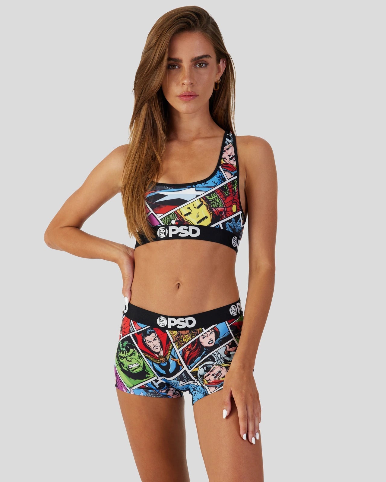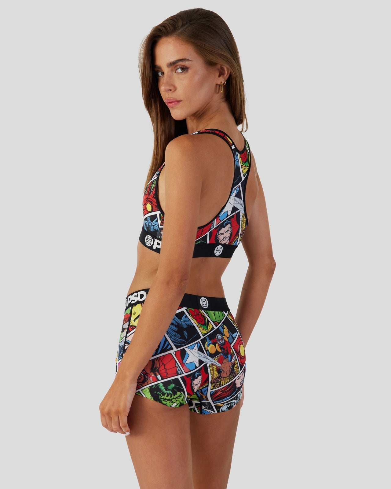 Featuring a retro comic strip. this Marvel Comics Underwear design includes beloved characters from the books like Dr. Strange. the Incredible Hulk. and Ant-Man. Made with our silky poly blend. the Boy Short is breathable yet slightly compressive. bringing you the comfort and support you need for everything you get into.