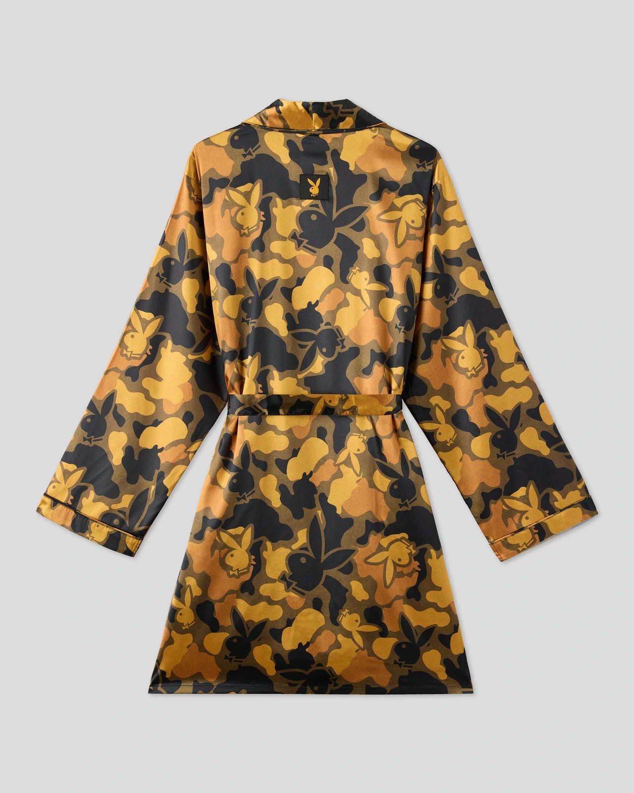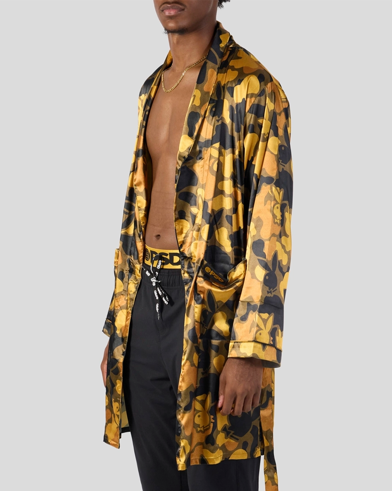 Lounge in luxury with the unisex Silk Gold Robe from Playboy x PSD. Made of a satin-based. silky fabric. it features a classic silhouette with a shawl collar. adjustable or removable belt. and two front pockets.