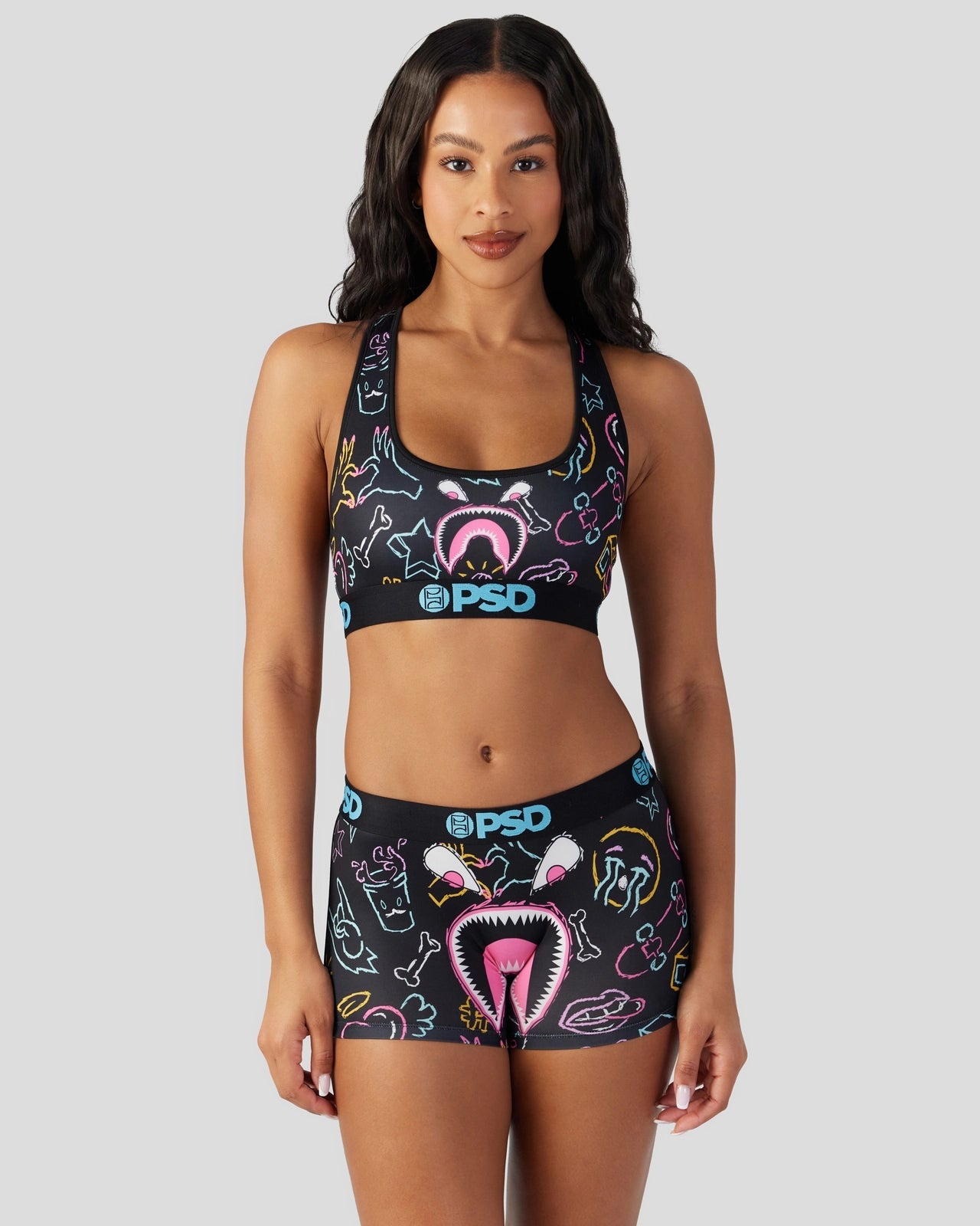 Introducing the latest Warface look to join the collection. Featuring our signature Warface alongside neon-colored doodles. the Warface Scribe Sports Bra is made from a silky poly blend with a comfortable full coverage. keep-you-in fit. The PSD boy shorts are perfect for everyday wear and working out.